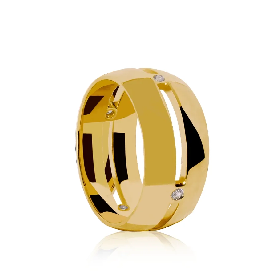 Este modelo em ouro 18K se destaca pelo design moderno e imponente. Com listras vazadas que percorrem toda a circunferência, exibe um estilo arrojado e exclusivo. Delicadamente cravejada com pequenas pedras brilhantes, acrescenta sofisticação. A largura mais robusta reforça sua presença, ideal para casais que desejam aliar elegância com personalidade marcante.