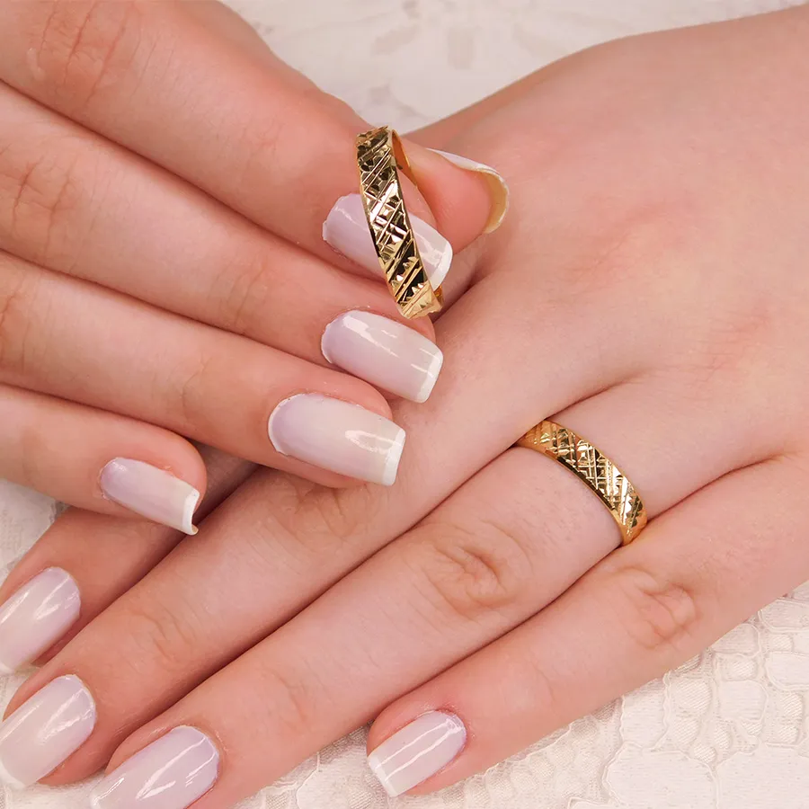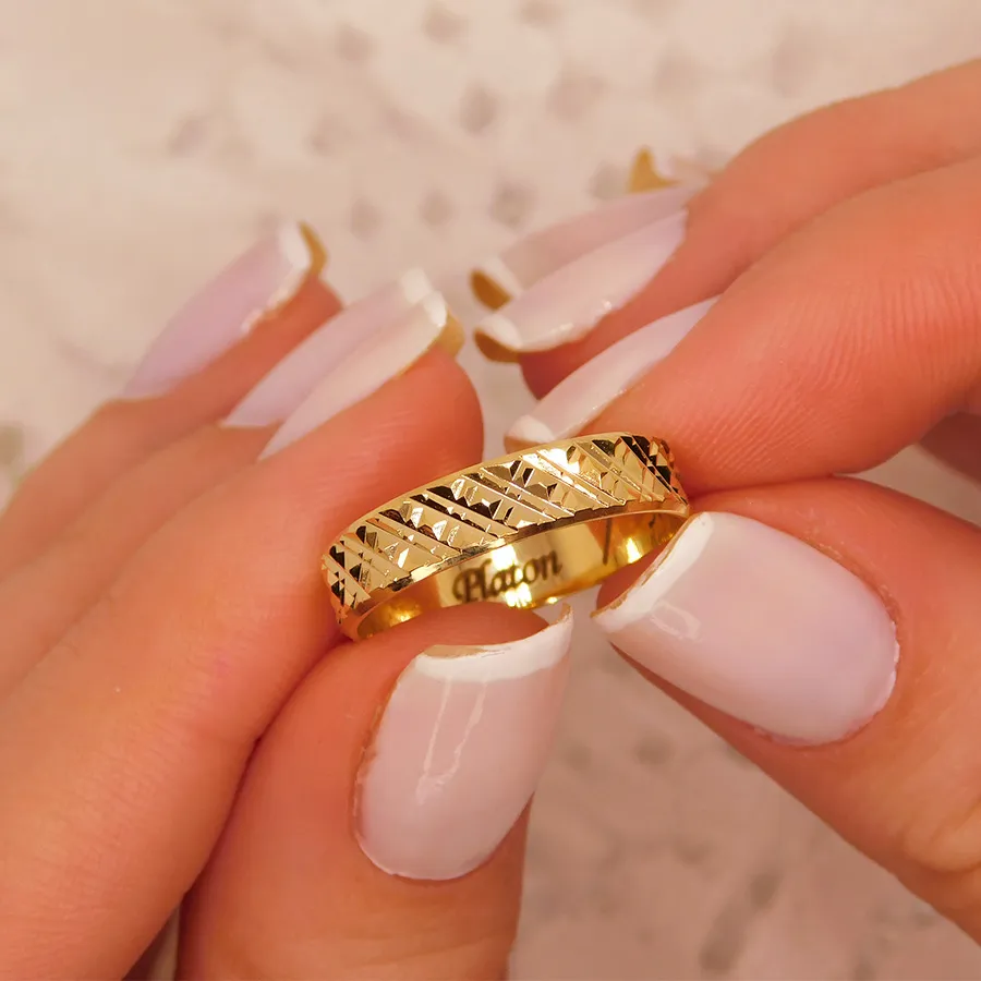 Casais modernos irão apaixonar-se pela aliança. Um modelo pouco mais trabalhado que permite sua usabilidade com qualquer combinação, seja com acessórios ou roupas, permitindo o uso diário com conforto e sem preocupações. Ideal para simbolizar o casamento e o sentimento entre dois eternos apaixonados. A aliança é esculpida em ouro 18K, no mais puro dourado. Seu acabamento é simples: polido. O formato interno reto possibilita todo o conforto no uso constante da joia. O detalhe da peça fica por conta do design diferenciado, o modelo não possui pedra.