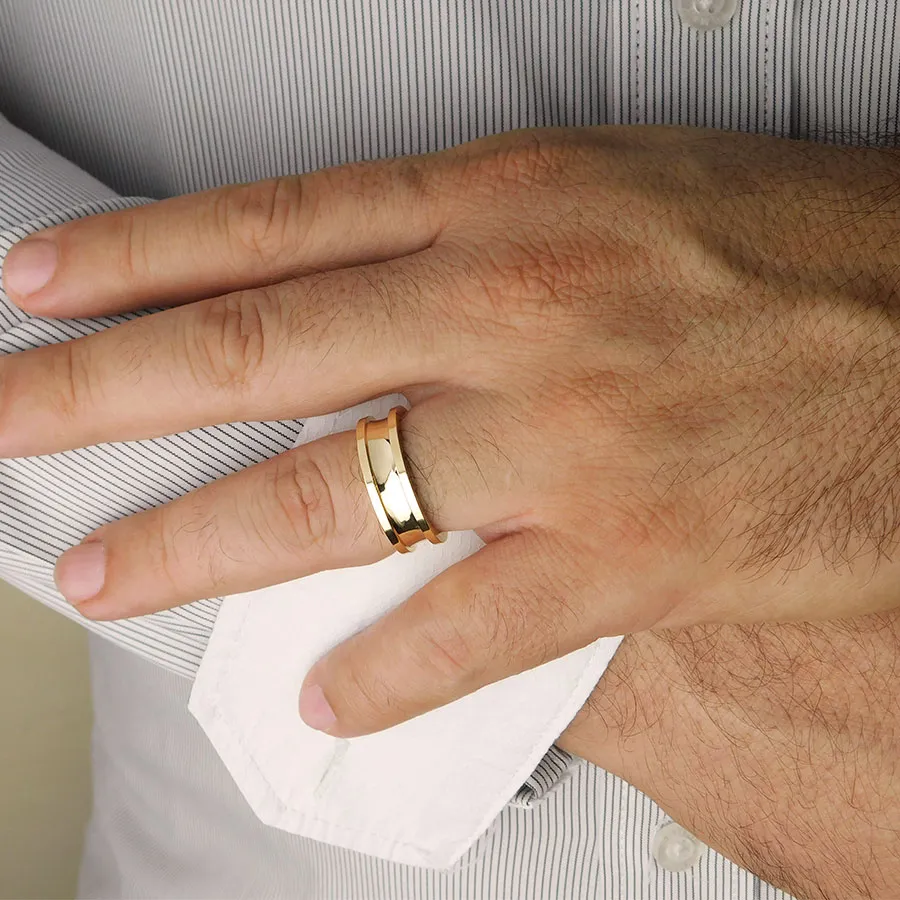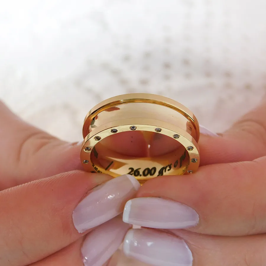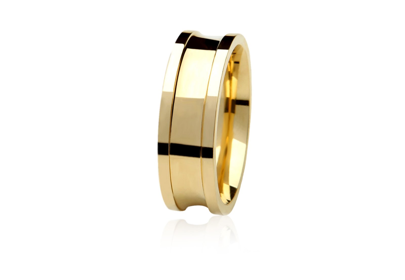 Este modelo é o presente perfeito para casais que buscam inovação em joias. Com um formato completamente diferente do tradicional, as peças atraem os apaixonados que anseiam por um diferencial. Modernas e contemporâneas, tornam-se símbolo do casamento. Seu formato completamente diferenciado dos modelos tradicionais possui acabamento liso e côncavo. O formato interno anatômico proporciona conforto na utilização. Suas laterais, mais elevadas do que o centro, dão todo o charme à joia. Quanto à peça feminina, esta ainda possui 30 pedras espalhadas pelo canto lateral, diferenciando-a ainda mais. Cada uma das pedras possuem 1mm e podem variar entre diamantes ou zircônias.