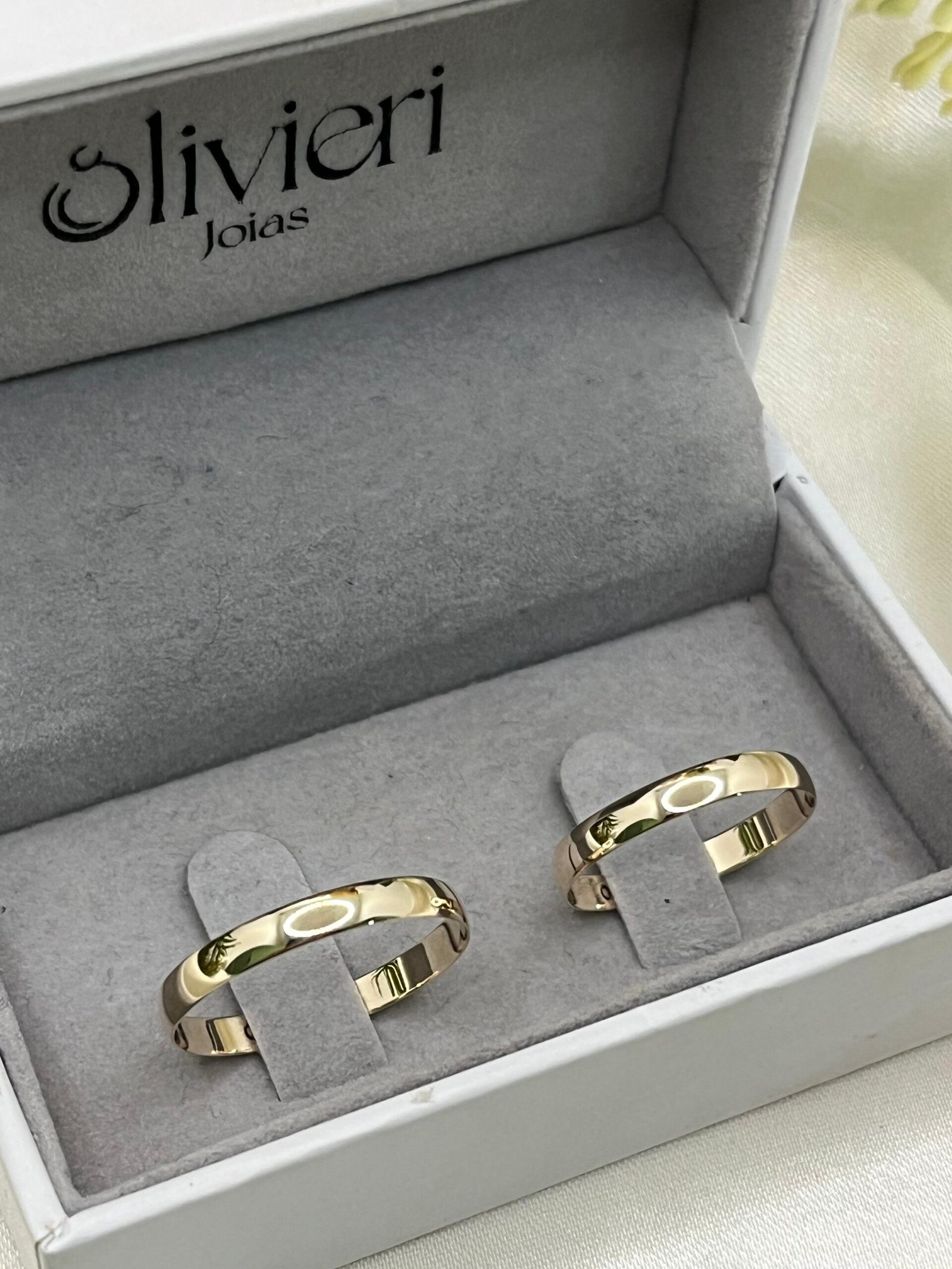 Em tempos remotos acreditava-se que o dedo anelar da mão esquerda tinha uma veia diretamente ligada ao coração, e por isso passou-se a usar a aliança de casamento dessa maneira, costume adotado até hoje em muitas culturas. Símbolo de compromisso e amor eterno entre os casais, uma aliança em valioso ouro 18k traduz fielmente a união dos cônjuges. O modelo mais tradicional e muito elegante combina perfeitamente com a delicada mão feminina, ao mesmo tempo em que confere ao homem a responsabilidade assumida. As alianças são leves, com fino acabamento polido e reto, prontas para a gravação dos nomes e da data do enlace.