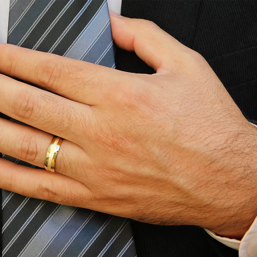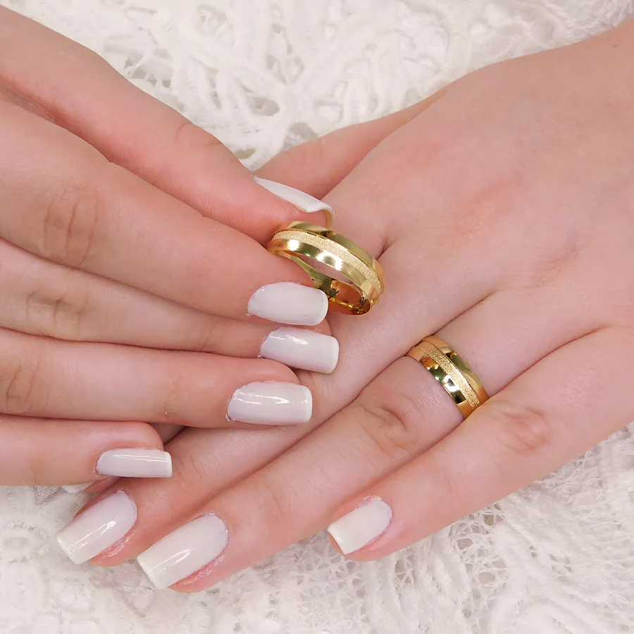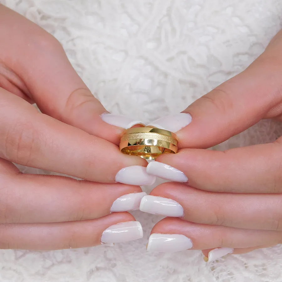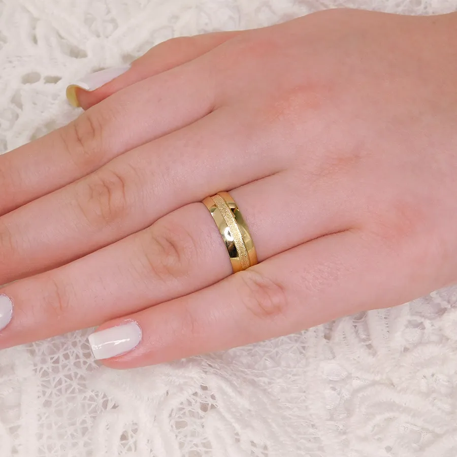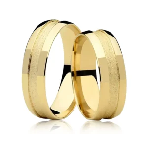 Casais modernos irão apaixonar-se. Um modelo trabalhado que permite sua usabilidade com qualquer combinação, seja com acessórios ou roupas, permitindo o uso diário com conforto e sem preocupações. Ideal para simbolizar o casamento e o sentimento entre dois eternos apaixonados. A aliança é esculpida em ouro 18K, no mais puro dourado. Seu acabamento é fosco e liso. O formato interno abaulado possibilita todo o conforto no uso constante da joia. O detalhe da peça fica por conta do acabamento no friso, o modelo não possui pedra.