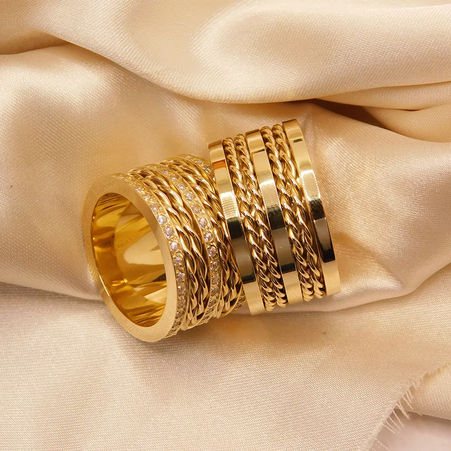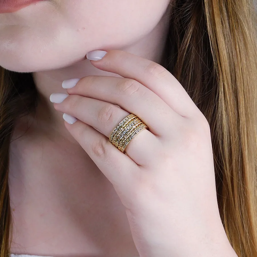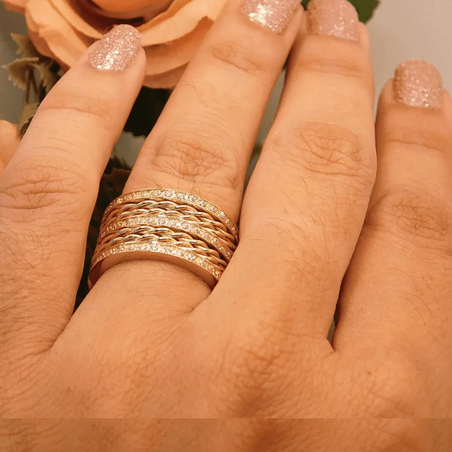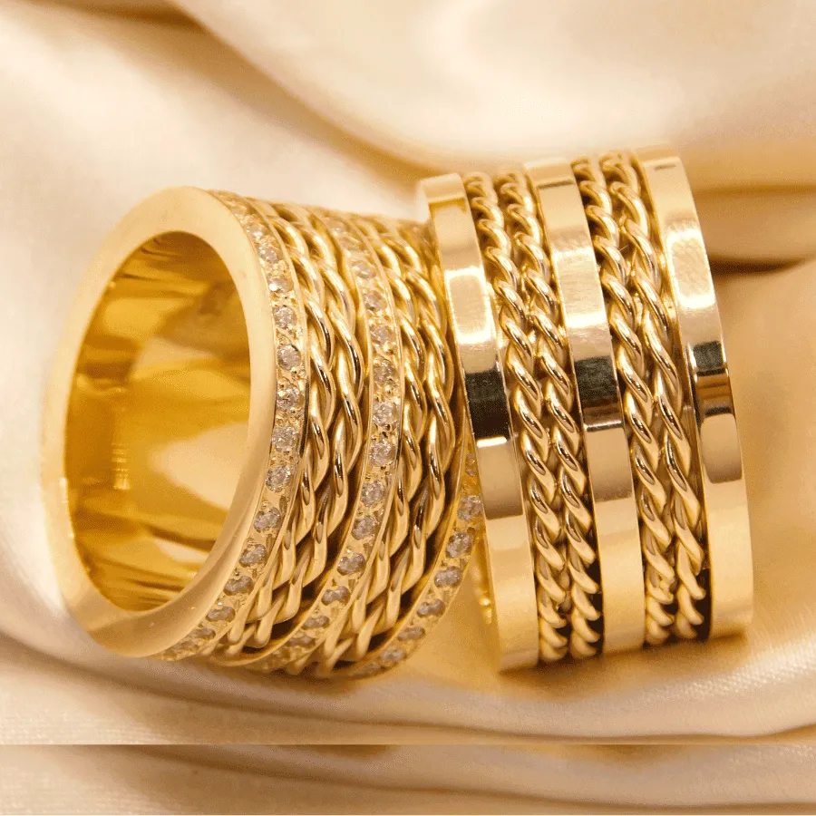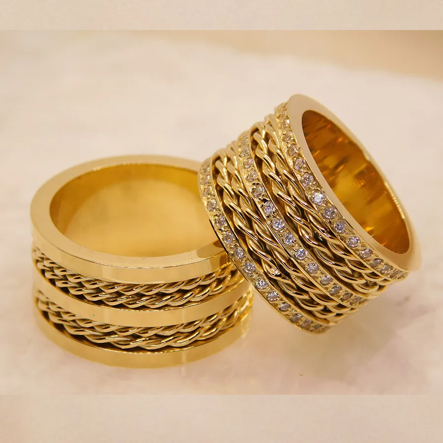 Este modelo em ouro 18K é marcado por tramas entrelaçadas que criam textura e requinte ao redor de cada peça. Na versão feminina, uma fileira de pequenas pedras adiciona brilho e sofisticação, enquanto a masculina mantém a mesma proposta de design, porém com acabamento mais sóbrio. O resultado é um conjunto imponente, perfeito para quem deseja um visual exuberante e cheio de personalidade.