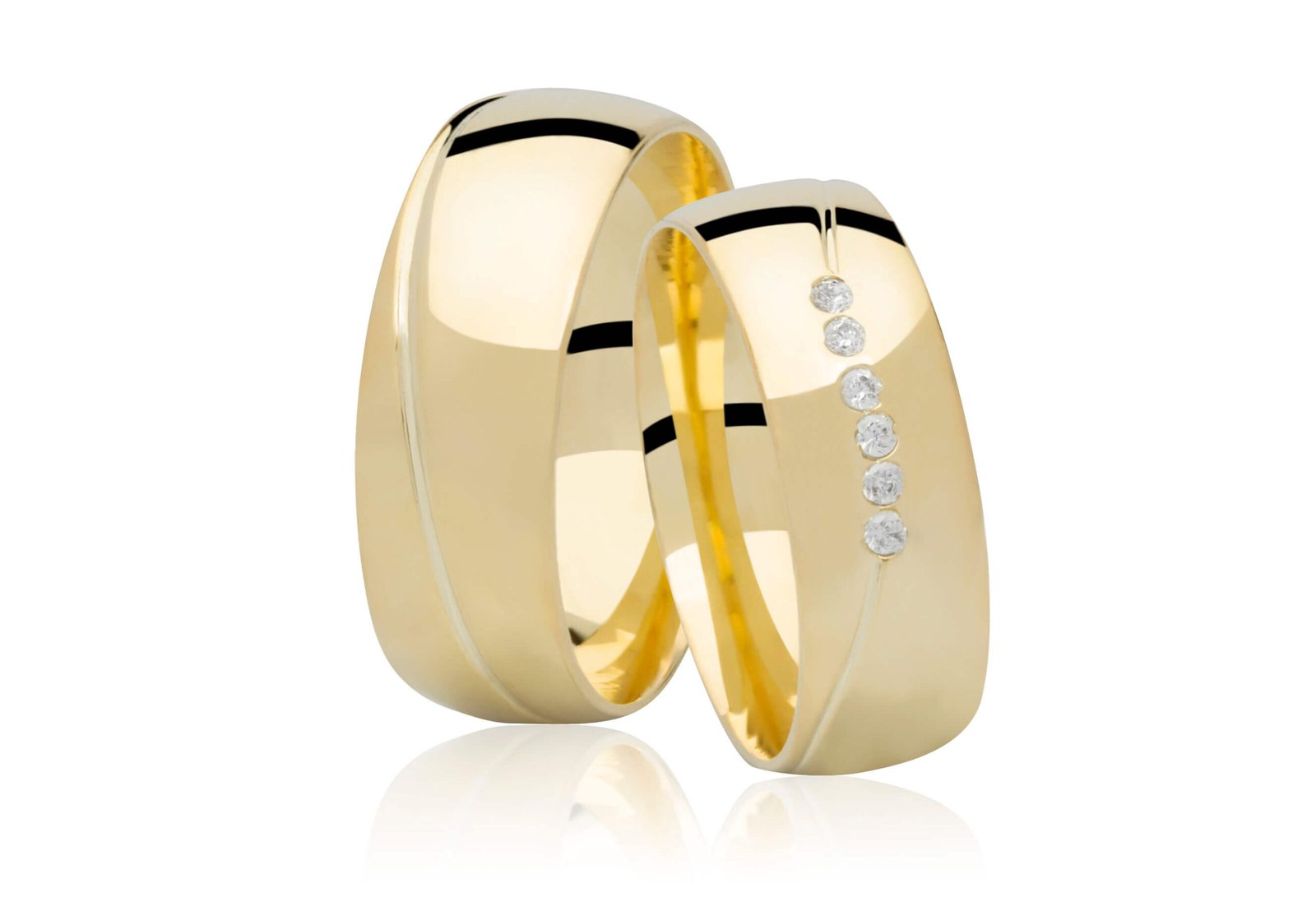 Casais modernos irão apaixonar-se pela aliança. Um modelo de luxo e com um belo design que permite sua usabilidade com qualquer combinação, seja com acessórios ou roupas, permitindo o uso diário com conforto e sem preocupações. Ideal para simbolizar o casamento e o sentimento entre dois eternos apaixonados. A aliança é esculpida em ouro 10k, no mais puro dourado. Seu acabamento é simples: polido. O formato interno abaulado possibilita todo o conforto no uso constante da joia. Os detalhes das peças ficam por conta das ilustrações feitas na parte externa das peças e suas 6 pedras de 1,5mm na feminina, as pedras são de zircônia.