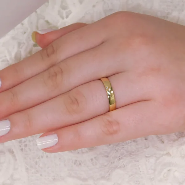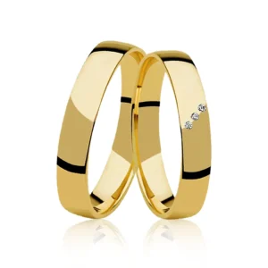 Nada melhor para a eternização de um momento romântico de um casal do que um belo modelo de aliança. Feito com ouro de 18k, possui 3 lindas pedras de 0,90mm na vertical, o que deixa a peça muito mais charmosa na mão dos noivos apaixonados. Tem um formato anatômico, 3,45mm de largura e 0,95mm de altura. Além disso, um formato externo arredondado e um acabamento liso. Para quem procura joias bonitas e elegantes, com certeza essa peça é uma combinação perfeita para celebrar uma união duradoura.