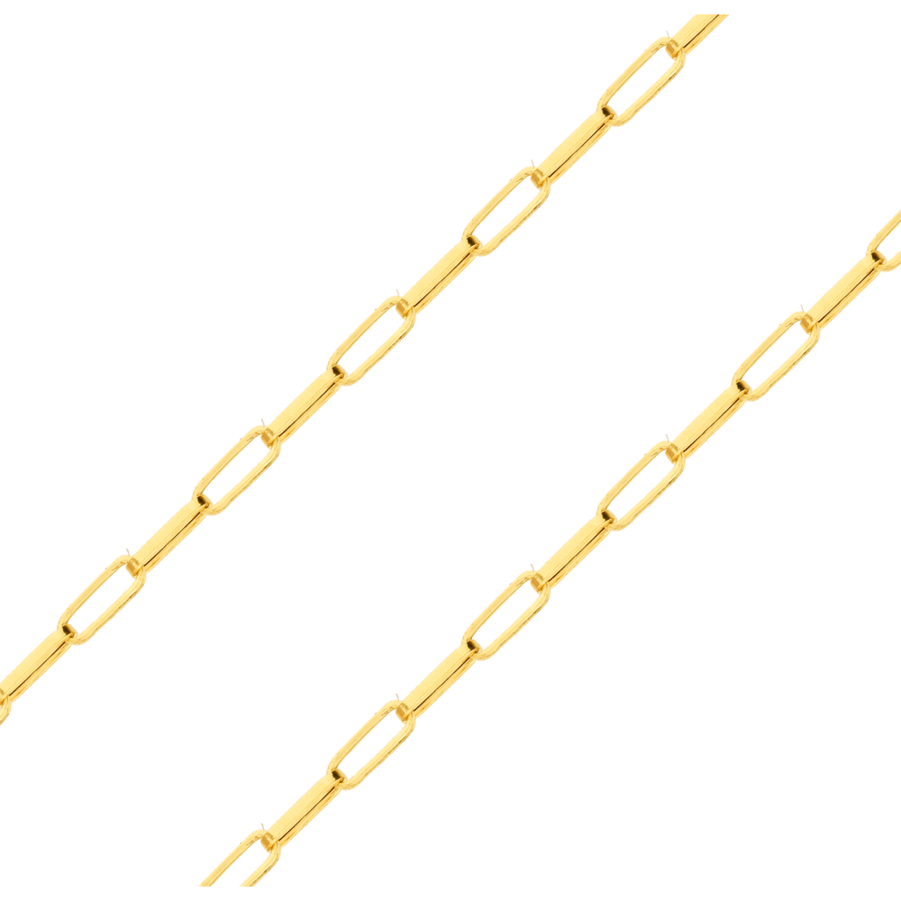 Elos quadrados alongados e uniformes, interligados com suavidade, eles possuem uma aparência achatada e polida, o que proporciona ótimo brilho e acabamento refinado. Por ser em ouro 18k, a corrente tem um tom dourado vivo, com brilho intenso e aparência luxuosa.